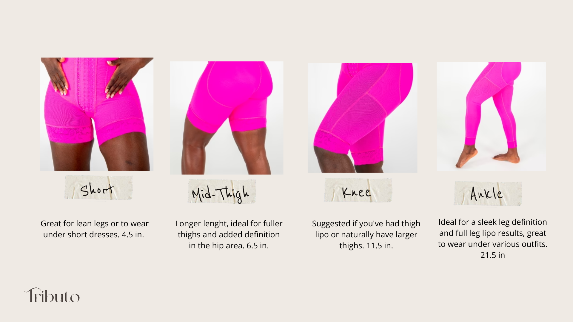 Leg lengths are standard, so the faja may sit higher or lower on the leg depending on the customer’s thigh length. If you’d like a different leg length, please mention it in the notes section when placing your order.