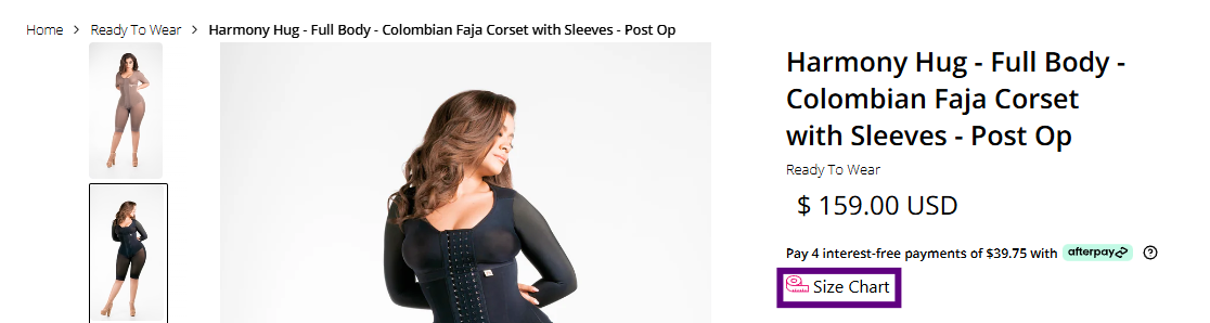 Remember that the size chart is ONLY for items sold by size. Custom fajas don’t use a size chart, since they’re made entirely based on your personal measurements.